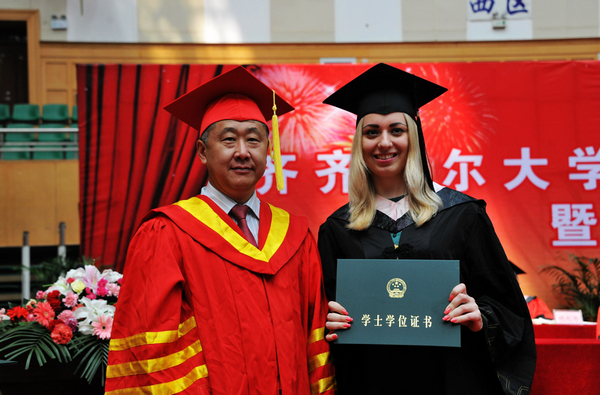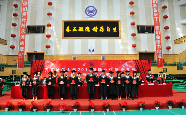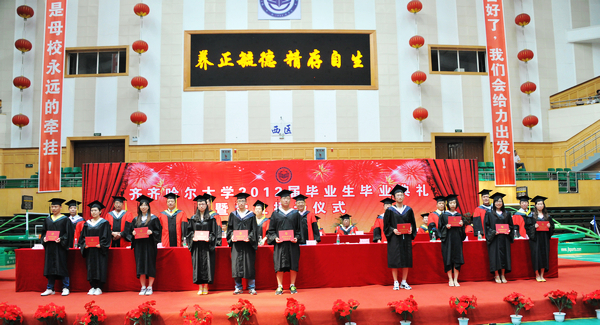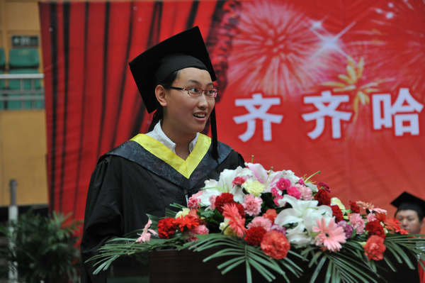 毕业生代表—计算机与控制工程学院自动化081班王丽婧同学在发言时表示,非常荣幸能在这个即将离开母校的时刻代表2012届全体毕业生发言。谨代表全体毕业生对辛勤工作、无私奉献的领导、老师表示衷心的感谢和崇高的敬意。作为一名学子,从天真无忧逐渐走向成熟,到庄严地接过毕业证书,从安静而详和的校园走向世俗而喧闹的社会,从齐大这个温暖的集体走向充满挑战的个人奋斗。……那铭刻了我们共同经历的日子,让我们受到了锻炼,增长了经验,也更让我们体会到了母校严谨的学风、教风和校风,体会到了那种团结向上的精神面貌。此刻,让我们再一次向领导和老师们说声“谢谢”,是你们用自己的言行和关爱使我们得到了远比书本知识更加宝贵的信念;让我们对美丽的校园说声“谢谢”,是它不变的安静、祥和记载了我们的奋斗与成长。让我们对彼此互相说声“谢谢”,让我们回想那纯真灿烂的笑容、朋友间的友谊,去感悟那美好的大学生活。“养正毓德,精存自生”这八个大字已在我们的心底刻下了深深的烙印。让我们把齐大精神带入我们未来生活的每一个细节,让我们把齐大的豪情与壮志带给我们周围的每一个朋友,让他们和我们一起共同努力,创造持久而辉煌的人生。希望学弟学妹们规划好自己的大学生活,按照既定的目标,付诸于实践,努力提升自身素质,塑造出属于你们自己的美好明天!今天,我们为齐大而骄傲,明天,齐大乃至祖国必将因我们而自豪。 值此母校六十年华诞之际,我代表全体毕业生祝我们的母校越办越好!