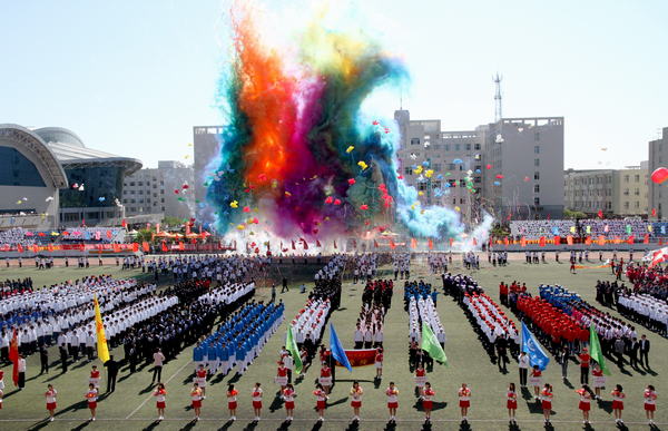 “创业、融合、跨越”,“凝神、聚力、发展”的彩练分外醒目鲜明,“以智慧和汗水诠释科学态度,以创新和奉献弘扬齐大精神,以思想和行动铸就爱国情怀,以青春和信念树立伟大理想”的大型条幅格外引人注目。西区体育场上,方阵猎猎,彩旗招展;体育健儿,英姿飒爽。
