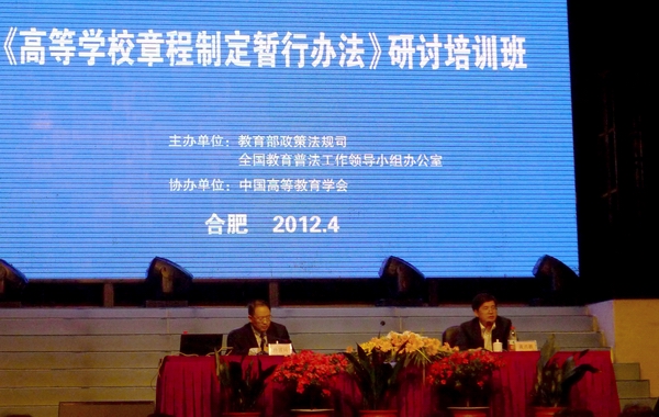 为进一步做好《高等学校章程制定暂行办法》的学习贯彻工作,推进高等学校章程建设,由教育部政策法规司、教育部全国教育普法工作领导小组、中国高等教育学会联合主办的《高等学校章程制定暂行办法》研讨培训班于2012年4月18-19日在安徽省合肥市举办。教育部政策法规司司长孙宵兵,副司长黄兴胜出席培训班会议。sunbet申搏党委副书记王凤琴,校长助理,党办、校办主任尹鸥参加了培训班的学习,来自全国各地300多所高校近500人参加了培训。