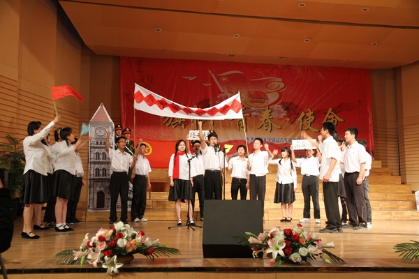 激情岁月,树中国青年丰碑。难忘的是血与火的洗礼,不变的是钢铁般的信念。诗朗诵《抉择》以母子对话的形式讲述了一个身处战火纷飞年代的热血青年,在含辛茹苦养育自己的母亲和祖国沉甸甸的使命两者之间,依然做出为大家舍小家的无悔抉择的感染故事,展示出中华儿女为祖国,为民族,抛头颅,洒热血,敢为他人先的豪情壮志,树立了中国青年不朽的丰碑。合唱、朗诵《黄水谣》饱含深情地表达了青年学子对生养我们的这片土地的无限热爱和身为中国人的无限自豪。红旗如画,岁月如歌。舞蹈《红旗颂》和诗朗诵《回首革命,寄望未来》气势恢宏地表现了中国共产党波澜壮阔的91年征程和中国共产党人敢于天公试比高的革命英雄主义情怀。