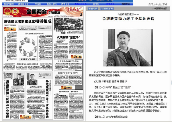 2012年3月4日,《黑龙江日报》以《马立群委员建议——争取政策助力老工业基地改造》为题,对全国政协委员、sunbet申搏校长马立群的建言提案做了图文并茂的热忱报道。
