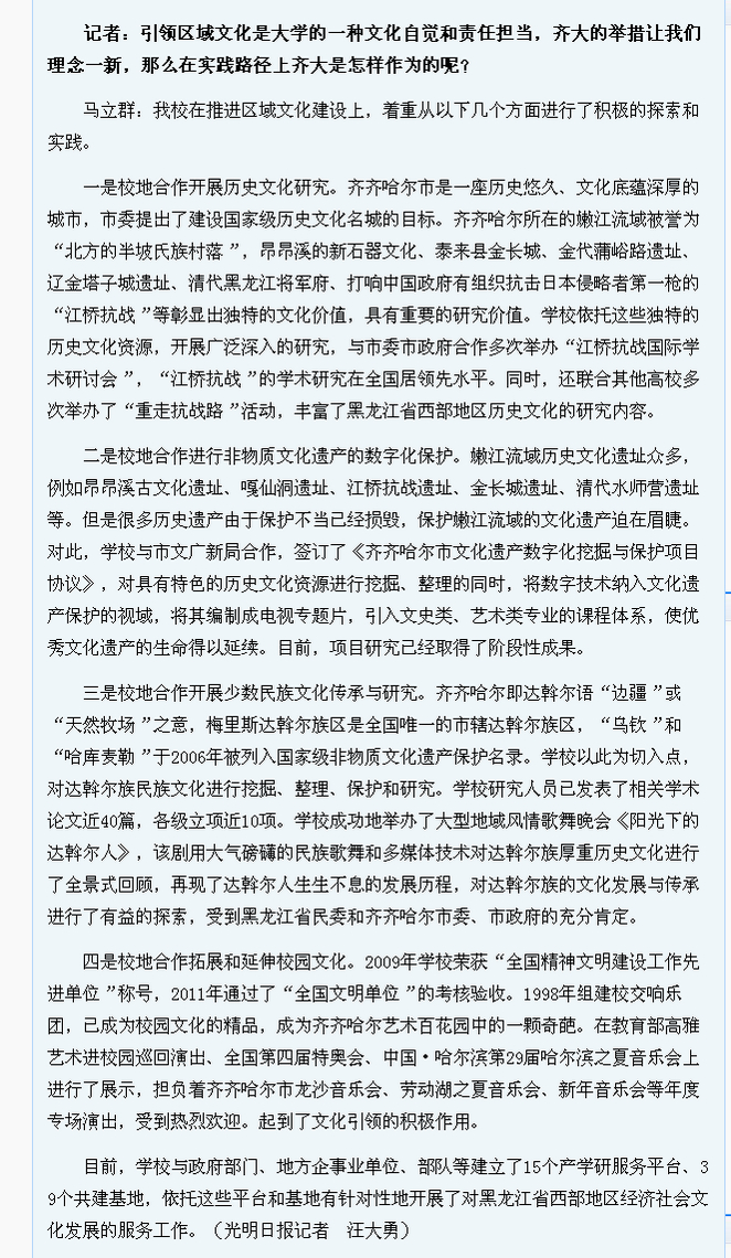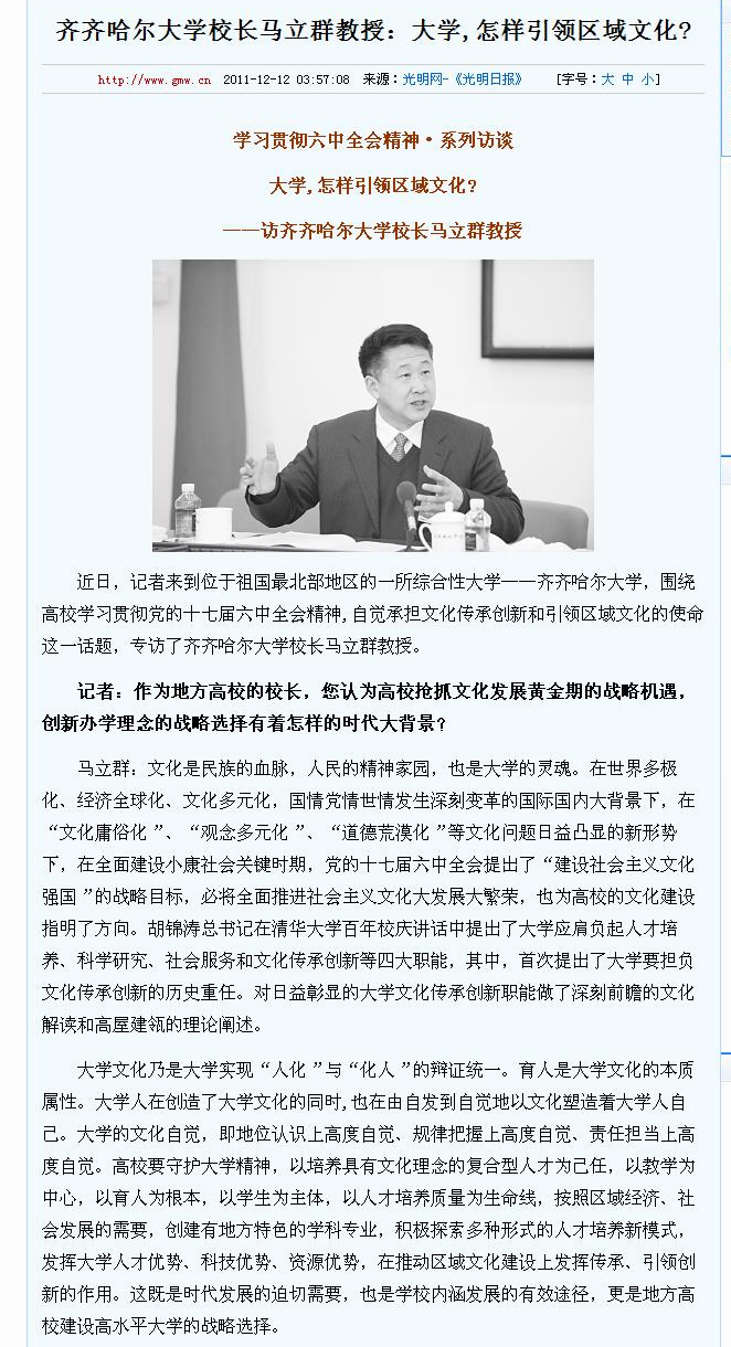 2011年12月12日,《光明日报》“教育时空”版的《学习贯彻六中全会精神·系列访谈》专栏以《大学,怎样引领区域文化?——访sunbet申搏官方网站校长马立群教授》为题刊发了记者汪大勇与校长马立群教授的访谈录。