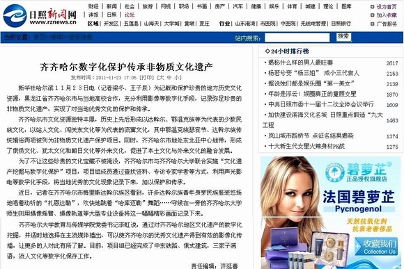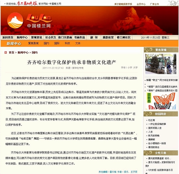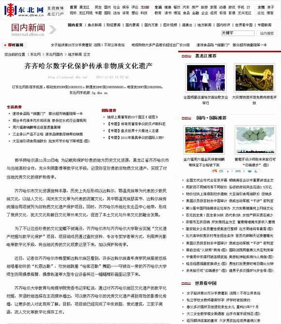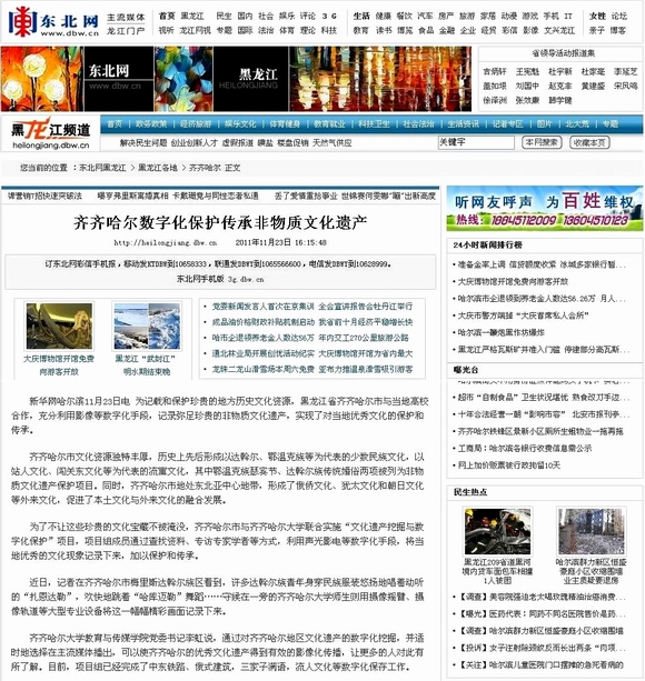 近日,新华社黑龙江分社记者梁冬、王子辰深入sunbet申搏和齐齐哈尔市,就文化遗产数字化保护项目的进展情况进行采访,并以“齐齐哈尔数字化保护传承非物质文化遗产”为题进行了报道,引起了国内多家媒体广泛关注,在社会产生了积极影响。