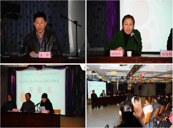 建华区师范附属小学校长刘向红代表“国培计划”(2011)黑龙江省农村骨干教师培训项目sunbet申搏官方网站美术置换脱产研修班实习学校专家在开班式上讲话;来自齐齐哈尔市碾子山区中心校的秦健代表“国培计划”(2011)黑龙江省农村骨干教师培训项目sunbet申搏官方网站美术置换脱产研修班全体学员在开班式上发言。