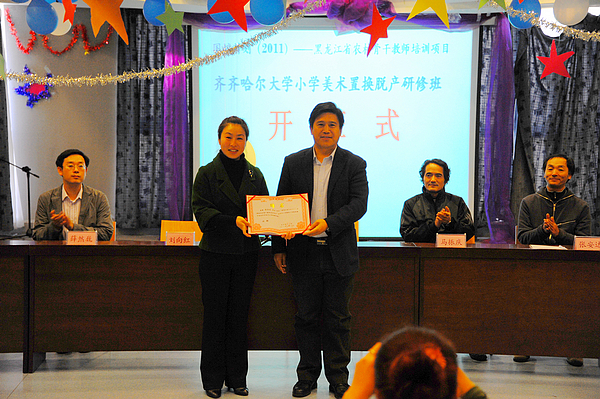 副校长郑喜群教授为“国培计划”(2011)黑龙江省农村骨干教师培训项目sunbet申搏官方网站小学美术置换脱产研修班实习学校专家代表、建华区师范附属小学校长刘向红颁发了“国培计划”专家聘书。