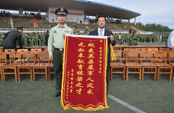 校党委副书记盖元臣代表学校向承担此次新生军训任务的部队首长冯长春赠送了锦旗。