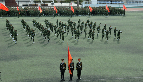 副校长郑喜群宣布2011级新生军训总结大会胜利闭幕,并再一次向承训部队官兵表示衷心地感谢。