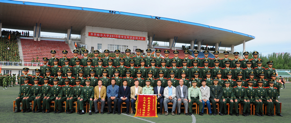 校领导盖元臣、张学军、姜守训、郑喜群、王刚、吕晓辉,承担此次军训任务的武警齐齐哈尔支队首长冯长春、周永波、佟金才,军训团有关领导邵丙军、李敏义、尹鸥及各学院党委书记在大会主席台就座。