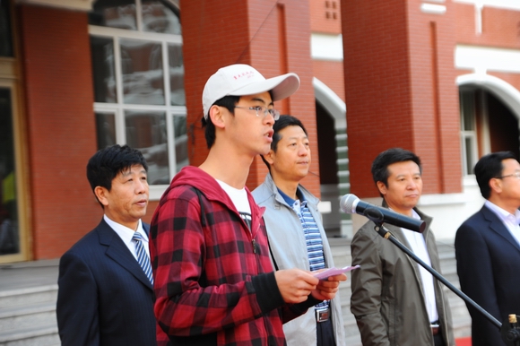 在出征仪式上,sunbet申搏文学与历史文化学院2011级历史系研究生刘贺代表参加“重走抗战路”主题活动的全体学生在启动仪式上发言,表达了“永远跟党走、永铸民族魂”的坚强决心,发出了当代大学生弘扬抗战精神、勇担时代重任的铿锵誓言。