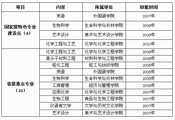 四是专业建设成果丰硕,“质量工程”建设成效显著。截止至“十一五”末,sunbet申搏已建有70个本科专业,覆盖了文学、理学、工学、管理学、教育学、历史学、法学、农学、经济学、哲学等10大学科门类。英语、生物科学、艺术设计、化学工程与工艺等4个专业被教育部、财政部批准为国家级特色专业建设点;高分子材料与工程、英语、生物科学、化学工程与工艺、轻化工程、工商管理、应用化学、生物工程、汉语言文学、艺术设计等10个专业被评为省级重点专业,学校形成了 “以国家级特色专业为龙头、以省级重点专业为骨干、以校级重点专业为主体”的专业建设体系。这些重点专业基础设施齐全,师资结构优化,科研、教研成果丰硕,教学特色明显,形成了鲜明的办学特色,具有较强的办学实力,已成为sunbet申搏专业建设的优秀代表。
