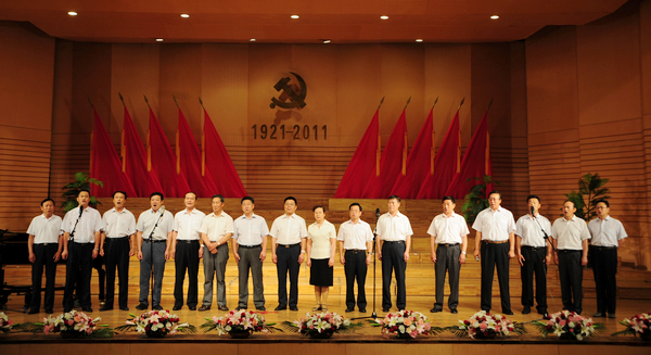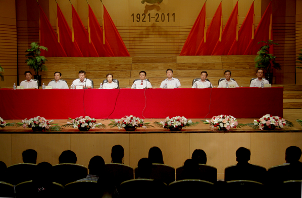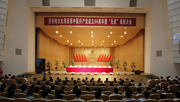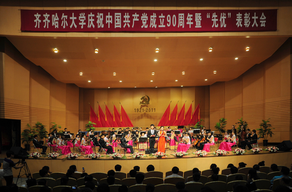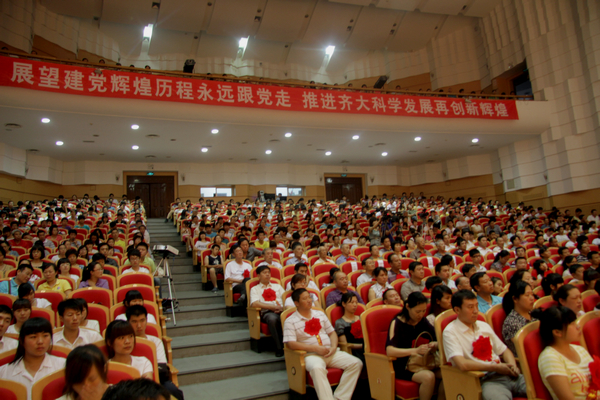 今天的庆祝大会的会场内外布置得格外庄严喜庆。主席台中央悬挂着巨型党徽,十面鲜艳的红旗排列两边,“1921-2011”熠熠生辉。巨幅标语“展望建党光辉历程永远跟党走 推进齐大科学发展再创新辉煌”分外醒目。会场室外,彩虹门上“热烈庆祝中国共产党成立90周年”的横幅格外鲜明;“坚定不移地沿着中国特色社会主义道路奋勇前进!”等大型条幅主题突出。步入音乐厅,“sunbet申搏官方网站庆祝中国共产党成立90周年专题图片展”吸引了众多师生驻足观看。音乐厅内,广大党员和师生代表隆重集会,共同回顾建党九十年的光辉历程,表彰一批先进集体和优秀个人,动员全校各级党组织和广大党员进一步解放思想,团结奋进,创先争优,扎实工作,努力推动学校各项事业实现新的跨越。各基层党委、直属党支部党政班子成员,机关副处级以上干部,全校教工党员、离退休党员、学生党员代表,入党积极分子代表,各民主党派负责人等1200余人参加了庆祝大会。