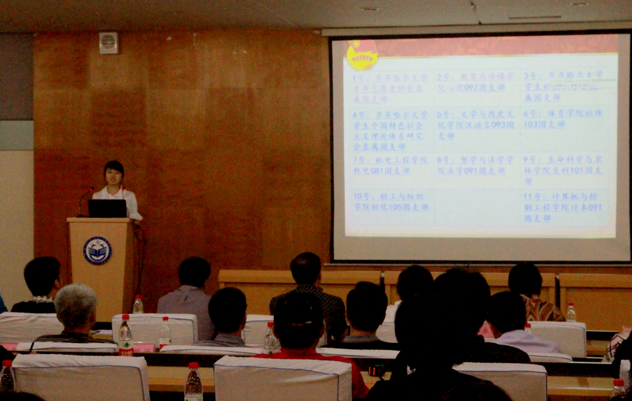 比赛中,各参赛团支部以视频或幻灯片的形式依次展示了本支部的主题团日活动的指导思想、设计路径和主要内容,图文并茂,讲解生动,深深感染着在座的每一位评委和观众。经过激烈角逐,文学与历史文化学院汉语言093团支部的《日出传奇·鹤城碎忆》主题团日设计方案以独特视角展示了团结向上、积极进取的先进团支部的精神面貌,得到评委们一致好评,荣获大赛一等奖;校青年志愿者协会直属团支部的《关爱残疾儿童,共创美好明天》和生命科学与农林学院生科101团支部的《学习生物技术,培养科学精神》主题团日设计方案获得二等奖;哲学与法学学院法学091团支部的《共筑梦想之路,我的班级我来秀》、计算机与控制工程学院计本091团支部的《责任·实践·成才》校学生社团联合会直属团支部《青春进行时》主题团日设计方案获得三等奖。赛后,团市委学少部部长刘文浩对本次大赛做了点评,与会领导和嘉宾为获奖团支部颁发奖品和证书。