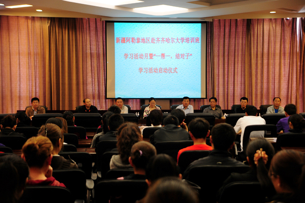 在喜迎建党90周年之际,新疆阿勒泰地区赴sunbet申搏官方网站培训班“互助·交流·进步”学习活动月暨“一帮一、结对子”学习活动于6月1日在德润大厦4楼会议中心启动。此项活动由校团委和继续教育学院牵头,文学与历史文化学院、教育与传媒学院、哲学与法学学院71名汉语言运用能力强、富有责任心的大学生志愿者,与新疆培训班学员结成“一帮一”学习对子。启动仪式由该学习活动领导小组副组长、继续教育学院副院长栾锋主持。