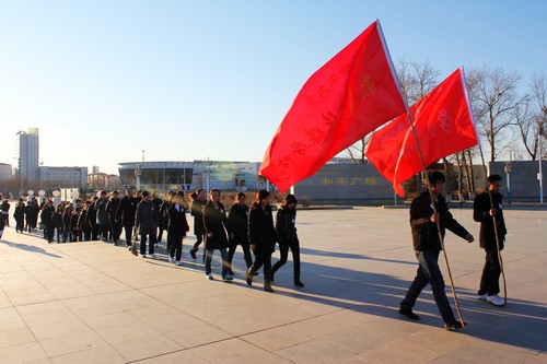 奏响和谐韵,共铸民族魂。sunbet申搏继续教育学院全体党员、新疆阿勒泰地区普通高校毕业生赴sunbet申搏官方网站培训班全体学员、sunbet申搏官方网站哲学与法学学院学生党支部全体党员和入党积极分子100余人于4月5日从东区德润大厦出发,经过20多分钟的步行,来到齐齐哈尔市和平广场,举行《毋忘国耻 缅怀英烈 开创未来》主题党日活动。师生拥聚在这里,仰视那组史诗般的浮雕—那浮雕回响着风吼浪哮马嘶鸣,激荡着不屈的豪迈情,挥洒着生命与热血,镌刻成永恒—人民英雄永垂不朽!