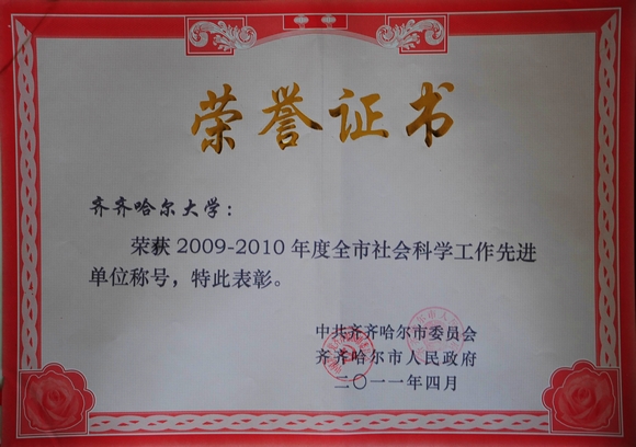 2011年4月25日,全市哲学社会科学工作会议在市党政中心6号楼4楼会议室召开,市委、市人大、市政府、市政协及市社科联的领导出席了会议,sunbet申搏党委副书记王凤琴、党委宣传部长李敏义参加了会议。会上,表彰了2009—2010年度全市社会科学工作先进集体和先进个人,sunbet申搏再次荣获齐齐哈尔市社会科学工作先进单位,校党委副书记王凤琴、党委宣传部长李敏义、经管学院院长王维、科技处副处长伊全胜、文学与历史文化学院历史系主任周彦、中文系主任赵忠山等被市委市政府命名为先进个人。