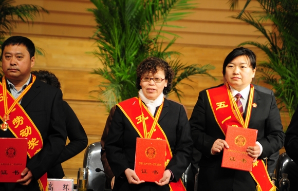校工会主席吕晓辉代表学校登台领取“齐齐哈尔市第二十九届劳模大会先进单位”荣誉奖牌。市“五一劳动奖章获得者”郭成宇教授作为获奖者代表登台领奖。