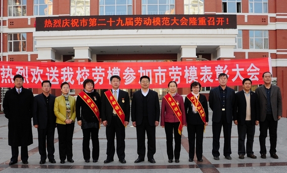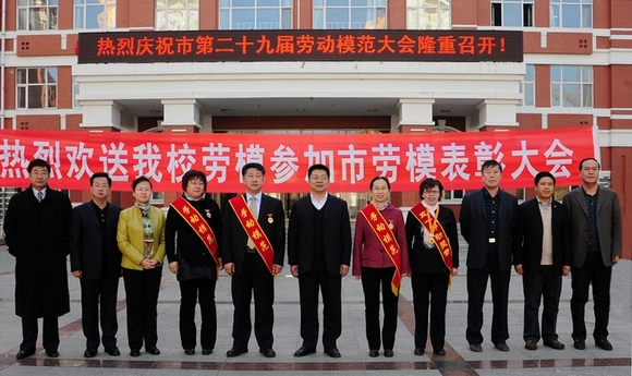 参会之前,sunbet申搏在中区主楼前广场举行了欢送仪式,学校领导李海红、马立群、王凤琴、盖元臣、郑喜群、王刚、吕晓辉及有关部门和学院领导向荣获“齐齐哈尔市第二十九届劳动模范”和“五一劳动奖章获得者”表示热烈祝贺并欢送他们入场。