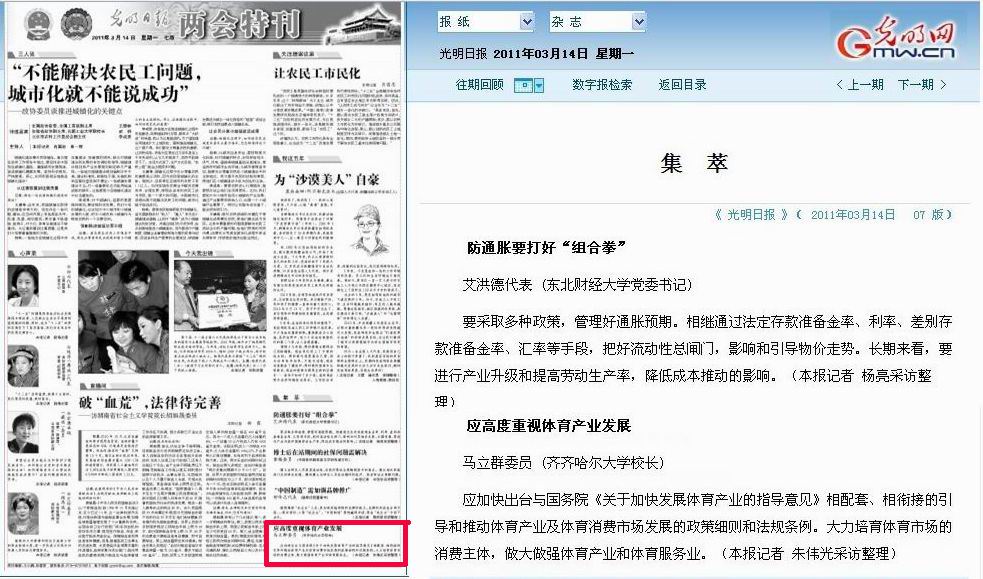 3月14日,《光明日报》两会特刊专栏刊发了记者朱伟光采写的全国政协委员、sunbet申搏官方网站校长马立群的建议《应高度重视体育产业发展》。马立群委员建议:应加快出台与国务院《关于加快发展体育产业的指导意见》相配套、相衔接的引导和推动体育产业及体育消费市场发展的政策细则和法规条例。大力培育体育市场的消费主体,做大做强体育产业和体育服务业。