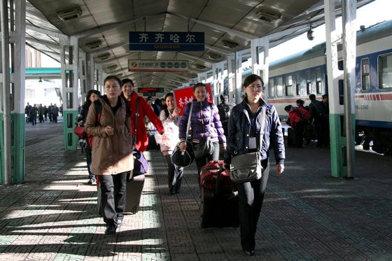 8:17,北京至齐齐哈尔的T47列车准点进站。当新疆阿勒泰地区赴sunbet申搏培训的71名参训学员和2名随队管理人员走下车厢的一瞬间,最先呈现在他们眼前的是“sunbet申搏官方网站欢迎您—新疆阿勒泰地区培训师生接站点”的鲜明标牌和热情的笑脸,使从新疆远道而来的师生倍感亲切。