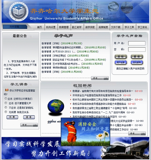 sunbet申搏官方网站学生工作部(处)网站是学生工作的综合性网站,为学校和广大学生搭建起了交流互动的平台,更好地满足广大师生相互沟通的需求。该网站下设有机构设置、教育管理、勤工助学、助学贷款、规章制度、文件下载、学子之声和学工快讯等七大版块;还设有处长信箱、学工调查等内容,提供给学生更多与学校交流、沟通的空间;该网站时时滚动更新的“最新公告”,第一时间为广大同学传达了最新的校园咨讯;定期开展的“网上知识竞赛”充分调动了广大同学的参与热情,更好地普及了相关知识,为营造和谐的校园文化氛围提供了保障。该网站不仅提供了最新校园的动态,还为广大同学提供了及时全面了解学校,了解自己的平台。“学子之声”栏目能够将学生们提出的问题及时反馈到校领导和相关部门,切实解决同学们遇到的问题。