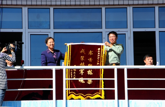 校党委副书记王凤琴代表学校向承担此次新生军训任务的65447部队首长刘明哲赠送了锦旗。