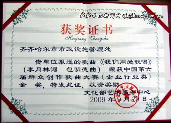 5月25日,由市城管监察局副局长李月林作词、sunbet申搏音乐与舞蹈学院副院长包明德教授作曲的市政工人之歌《我们用爱歌唱》荣获中国第六届群众创作歌曲大赛(企业行业类)金奖,并被编入中国广播电视出版社出版的中国第六届群众创作歌曲大赛获奖作品集《神州歌海》之中。