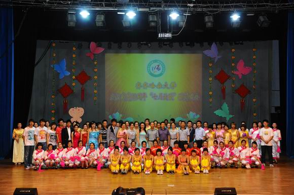 闭幕式结束后,与会领导和现场师生一起观看了精彩的文艺演出。“庆祝建党89周年‘七月放歌’歌舞晚会”在气势恢宏的大型舞蹈《奋斗》中拉开了帷幕,参加演出的节目均由各学院、校大学生艺术团精心选送,是同学们自编自演的原创作品。这些作品巧妙地将校园生活同讴歌改革开放、歌唱伟大祖国相结合,将新一代大学生的成长成才同创建文化校园、构建和谐社会相结合,突出反映了sunbet申搏校园文化建设的最新成果,反映了同学们乐观向上、不断进取、勤奋踏实、自信自强的精神面貌。演出结束后,与会领导和嘉宾同参演人员合影留念。