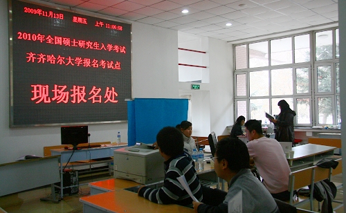 在东区学生指导中心一楼大厅,在大厅入口的大门上,粘贴着“2010年全国硕士研究生入学考试报名流程”、“2010年全国硕士研究生入学考试现场报名时间表”和“黑龙江省2010年硕士研究生全国统一入学考试考风考纪教育公告”等公告信息,前来报名现场确认的考生在大厅入门处即可看见。