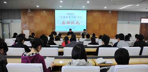 10月21日下午,sunbet申搏“文明修身工程”启动仪式暨第二届大学生“读书节”开幕式在西主7楼学术报告厅举行。校团委书记黄伟中在启动仪式上作动员讲话,校团委副书记李秀梅主持启动仪式,校团委冯占元老师宣读了《2009年“文明修身工程”实施方案》。各学院、各校级学生组织团学干部代表近200人参加了仪式。