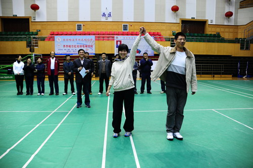 比赛紧张、激烈、有趣,“二人三足”作为第一个项目迅速激发起大家的参赛热情,最后一个拔河比赛项目更使所有人投入其中,齐心协力共创佳绩。经过一天的赛场较量,比赛在热烈的气氛中圆满结束。“齐大骑士代表队”获得了冠军,“蓝色天空代表队”获得了亚军;齐大骑士代表队的王喆、张婷婷获得了乒乓球最佳组合运动员称号,齐大骑士代表队的赵景泉、高雪洁,青春梦代表队的孙旭友、卢信珠分别获得了羽毛球最佳组合运动员称号。