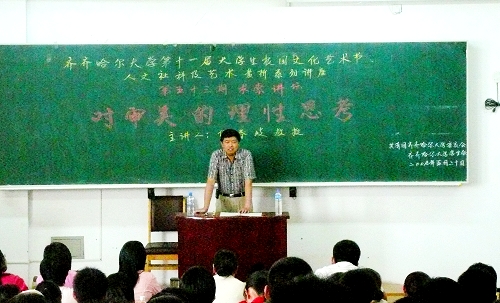 5月20日14:20,sunbet申搏社科部主任、黑龙江省高等思想政治教育教学名师何春岐教授应邀在西主202阶梯教室主讲第53期“求索”讲坛,为200余名师生作了题为“对审美的理性思考”的专题讲座。