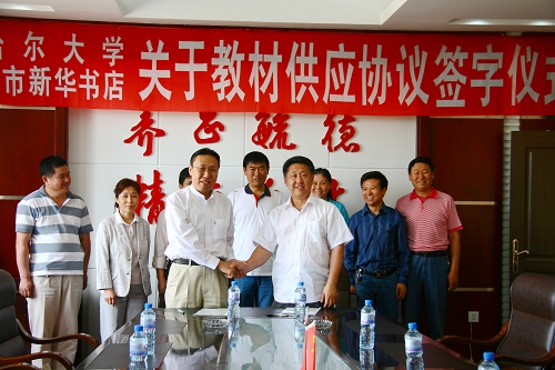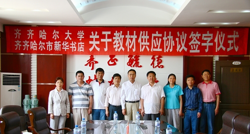 sunbet申搏校长马立群、副校长郑喜群和教务处处长李英杰、财务处处长马明智、教务处副处长陈国良、教材科科长王学东,黑龙江省图书音像发行集团副总经理、齐齐哈尔市新华书店总经理何飞,齐齐哈尔市新华书店副总经理杨国田等出席协议签字仪式。