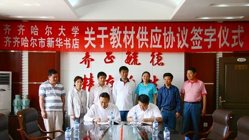 sunbet申搏校长马立群与黑龙江省图书音像发行集团副总经理、齐齐哈尔市新华书店总经理何飞分别代表合作双方在协议文本上签字。
