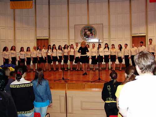 音乐会上,第一个节目是用中文合唱的中华人民共和国国歌,当歌声响起,全场起立,马校长一行也一齐放声高唱,这个意外的节目使大家深深感受到中乌两国人民的深厚友谊和马里乌波尔大学师生对马立群校长一行的欢迎之情,后来得知这场音乐会是该校学生为了欢迎中国客人用了一个月的时间精心排练而成的。