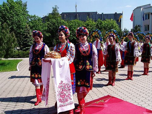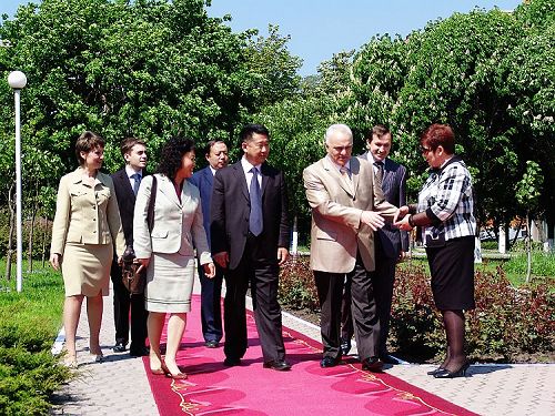 在康.瓦.巴拉巴诺夫校长和两位副校长的陪同下,马立群校长走上红地毯,三名乌克兰少女手捧面包和盐款款走来,拿起面包沾上盐这是乌克兰欢迎贵宾的最高礼节。