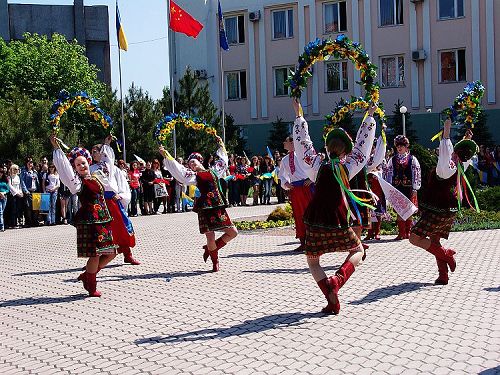 马立群校长一行到达马里乌波尔大学受到热烈欢迎。该校两位副校长在校门前迎接,校园内众多师生已聚集在广场上等候中国客人的到来。乌克兰青年男女身着民族盛装,跳起欢快的民族舞蹈。