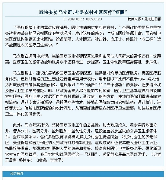 3月11日出版的黑龙江日报以《政协委员马立群:补足农村社区医疗"短腿"》为题进行了报道。