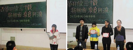 该院14名选手分别以他们饱满的热情和对祖国的无限热爱描述了中国改革开放三十年来天翻地覆的变化和对改革开放的无限赞美,现场气氛活跃振奋,掌声热烈。最终计本081班刘佳的《征程三十载,辉煌在东方》荣获一等奖。软件081班王会敏的《改革开放,再创辉煌》和自动化081班王丽婧的《情系1978》荣获二等奖。软件082班的李嘉祥、自动化081班的韩兴龙、计本085班的卓越荣获三等奖。