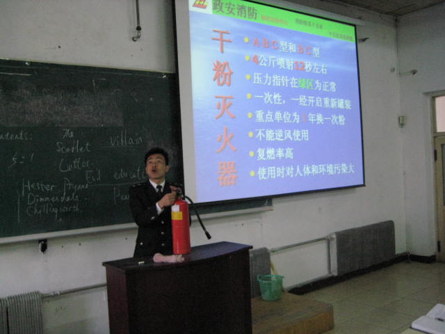 理学院于11月底邀请黑龙江政安消防知识宣传培训中心彭延军教官作消防安全知识讲座,全院教职工和学生代表聆听消防知识讲座。一张张惨不忍睹的火灾现场图片,一个个因火灾永远逝去的鲜活生命的照片,在广大师生心中引起了强烈的震撼,更加充分认识到火灾的无情以及“防患于未然”的重要性。彭延军教官针对火灾发生的主要原因、火灾发展走势图、灭火器的种类、火场逃生技巧、家庭消防“四件宝”等方面的知识进行了详细讲解,并结合灭火器的分类讲解了使用办法,使师生进一步增强安全意识,受到一次深刻安全教育。