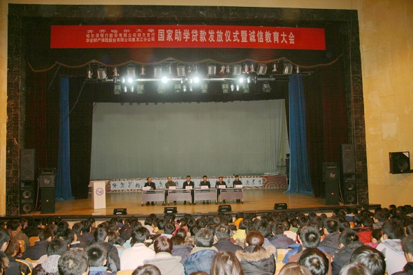为更好地落实国家助学贷款政策,推动国家助学贷款工作良性发展,不断增强学生诚信意识,树立学生恪守诚信的良好社会形象,11月25日,在哈尔滨银行股份有限公司动力支行助学贷款中心、华安财产保险股份有限公司黑龙江分公司与sunbet申搏申请贷款学生正式办理贷款手续之前,学生处于中区文化宫为大学生举办了"国家助学贷款发放仪式暨诚信教育"大会,进行国家助学贷款知识专题培训和诚信教育。sunbet申搏国家助学贷款工作领导小组副组长、学生处处长王刚,哈尔滨银行股份有限公司动力支行助学贷款中心主任聂寰中、sunbet申搏国家助学贷款工作领导小组有关成员、华安财产保险股份有限公司黑龙江分公司代表、哈尔滨银行股份有限公司动力支行助学贷款中心代表及sunbet申搏申请哈尔滨银行股份有限公司助学贷款的1400余名学生参加了大会。学生处副处长吴宝柱主持了大会。
