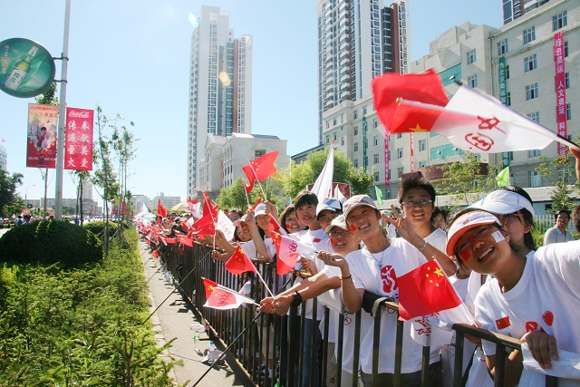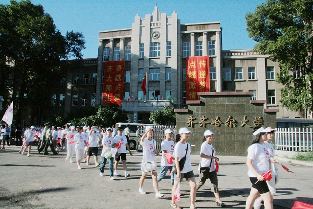 “中国加油!奥运加油!北京加油!”8时许,当宣布北京2008奥运火炬接力齐齐哈尔传递活动开始时,全场沸腾。师生们竞相挥舞着手中的国旗和奥运会会旗,呐喊声此起彼伏,现场气氛热烈。第一棒火炬手刘艳手持火炬,与护跑手会合起跑,开始了奥运圣火在齐齐哈尔的“和谐之旅”。