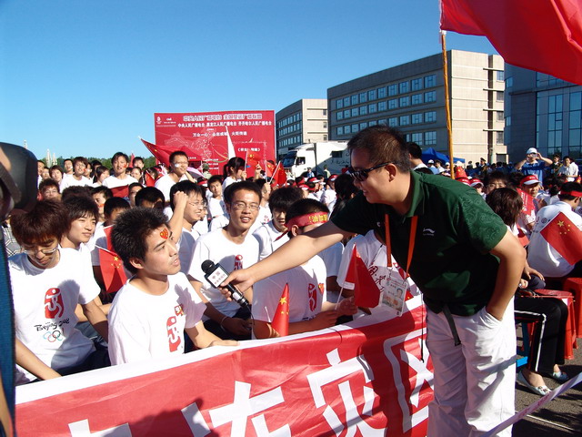 在火炬传递起点仪式上,中央电视台记者对sunbet申搏现场助威的机械工程学院的同学进行了采访。