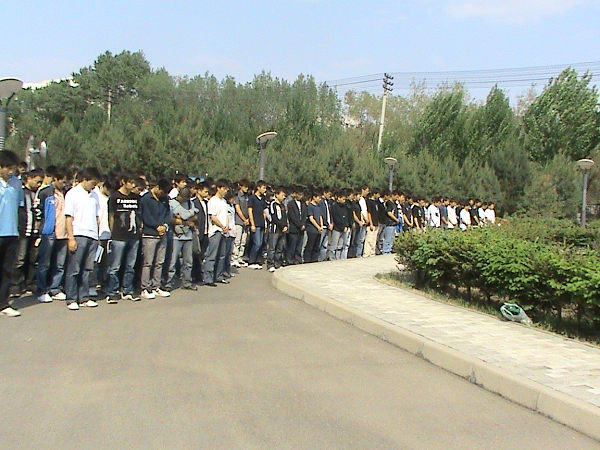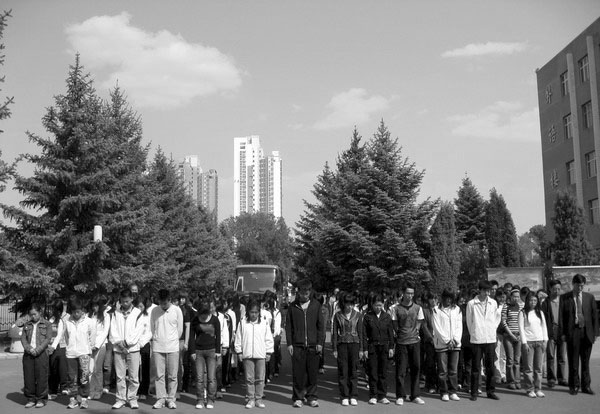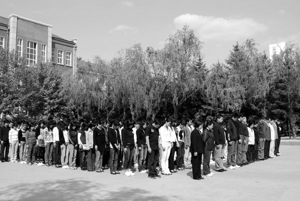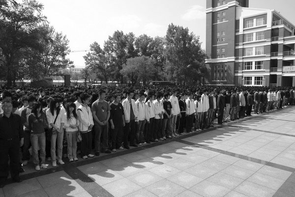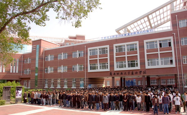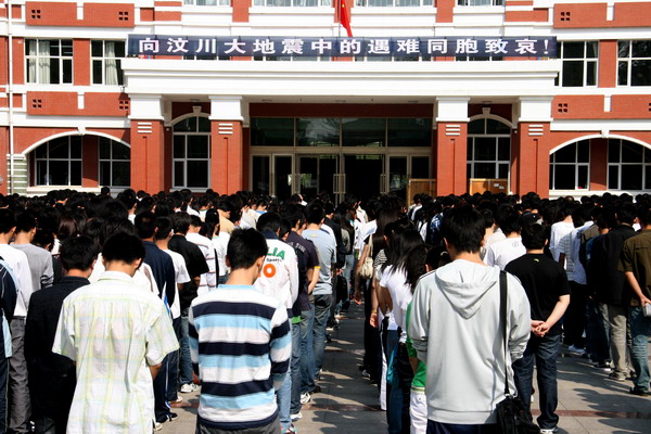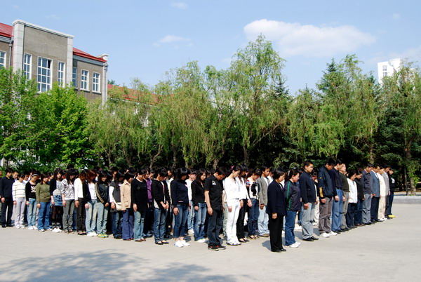 在校的校领导王凤琴、曲伟建、郑喜群、吕晓辉与万名师生同殇。副校长曲伟建在中区主楼前主持了集体默哀仪式。他指出:“今天我们全校在这里举行集体哀悼,以表达对汶川大地震遇难同胞的深切缅怀和追思,愿逝者安息,生者坚强。”