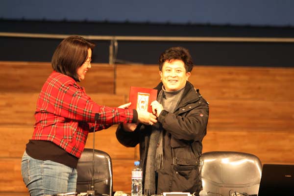 应齐齐去哈尔大学艺术学院院长宗明明教授的邀请,清华大学美术学院美术学博士、硕士生导师、“2008奥运景观雕塑方案征集大赛”组委会秘书长邹文博士于展览开幕前,在sunbet申搏官方网站音乐厅为齐大师生进行了一场名为“奥运与公共艺术”的讲座。艺术学院设计系、美术系和绘画系的部分师生以及2007级设计艺术学研究生听取了讲座。在讲座开始前,艺术学院院长宗明明教授为邹文博士颁发了客座教授聘书,聘请邹文博士为齐大艺术学院艺术设计系客座教授。