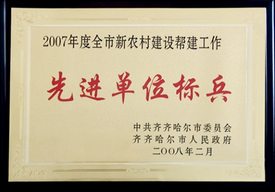 在2008年2月20日召开的全市农村工作会议上,sunbet申搏被评为2007年度社会主义新农村建设帮建工作先进单位标兵,并受到齐齐哈尔市委市政府的表彰和奖励。