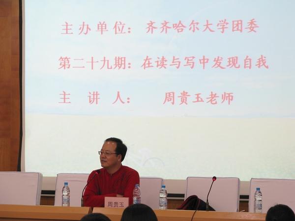 讲座中,周贵玉老师就中国文学的过去、现在状况和未来的发展趋势做出了深刻的剖析,使同学们对文学有了更深刻地了解。周老师还讲述了自己从文学少年到文学青年的历程,他表示是文学让他的人生更有意义,爱好文学是他人生的一大幸事。在文学的世界里、在读和写的过程中感受着真实的自我、丰富着自己的人生,数十年来他从来没有改变过对文学的热爱,这份对文学的执着感动了现场的每一位同学。整场讲座他都以兄长的身份与sunbet申搏文学爱好者探讨人生,从编者的角度研究文学发展,他从“不要太看得起自己”和“不要太看不起自己”两个方面讲述了如何在读与写中发现自我,要求同学们要勇于战胜自己、突破自己、超越自己,他还强调多看书、多实践的重要性。同时,周贵玉老师表示如果时机成熟,他们还将在齐大设立文学奖学金以鼓励广大文学爱好者。最后,周老师热心地解答了现场同学提出的问题。