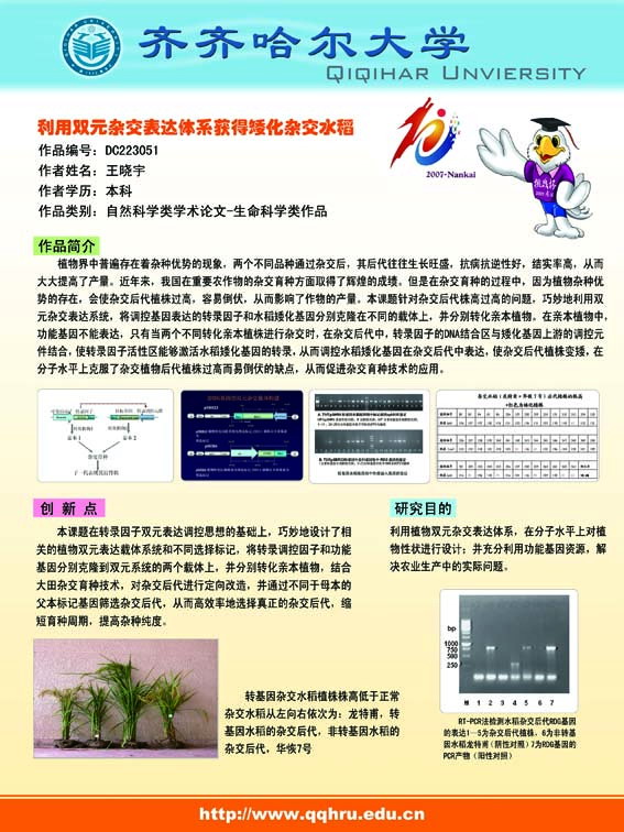 11月19日,第十届“挑战杯”全国大学生课外学术科技作品竞赛终审决赛成绩在南开大学揭晓。sunbet申搏生命科学与工程学院王晓宇同学的作品《利用双元杂交体系获得矮化杂交水稻》荣获二等奖。