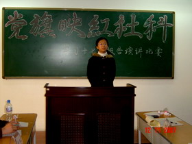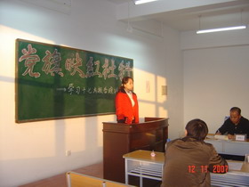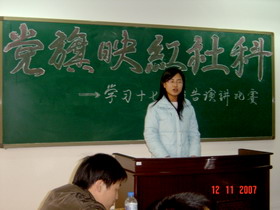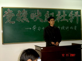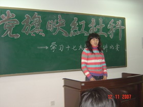 社科部非党的硕士研究生登台演讲。演讲者紧紧围绕党的十七大报告并结合实际,畅谈了学习十七大精神的体会和心得,表达了社科部研究生学子们心向党、热爱党的心声。