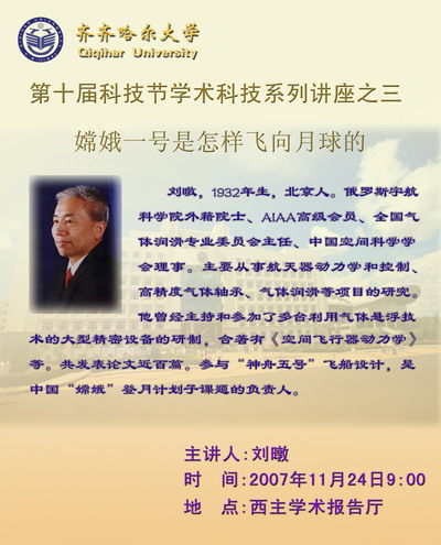 据了解,校团委为了更好地让同学们了解“嫦娥一号”、了解我国航空航天事业的发展,在第十届大学生学术科技节期间,先后邀请校老年科协专家从不同侧面和角度,为大学生解读《“嫦娥一号”的人文意义》、《“嫦娥一号”的测与控》等问题。