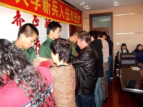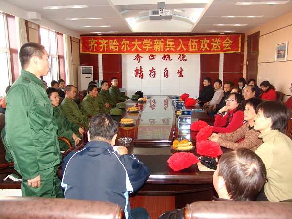 会上,老师和学生代表先后发言。入伍新兵们所属院系的领导为他们佩戴了光荣的大红花。校领导向他们赠送了精美的纪念品。